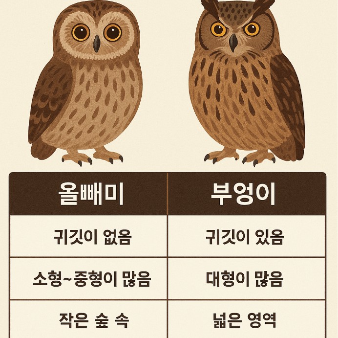 - 올빼미: 귀깃이 없어 머리가 둥글고 부드러운 인상